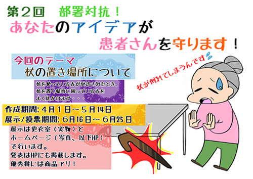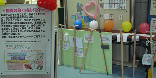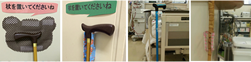 この取り組みで作られたアイデアグッズは、病棟や外来で患者さまに使っていただいています。杖置きはとても重宝されているようですよ!!